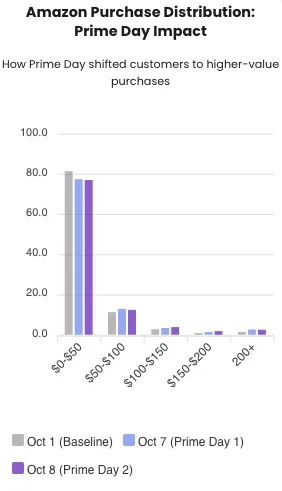 The distribution shift reveals the strategy. On a typical day, 82% of Amazon purchases are under $50. During Prime Day, that dropped to 78%, meaning 4+ percentage points of transactions moved into higher-value tiers: